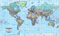 A world map is one of the most complicated cartographic art forms possible. We have published world maps in conjunction with other firms in years past, most notably the silk-screen-printed 5'x8' version, which is the largest single sheet map of the world ever printed. This map, for which we provide a picture included with this newsletter, uses a Miller Cylindrical (WGS 84) Projection at a scale of 1:30,000,000. It is a political map, with countries shown in differing colours, and uses hill shading relief to portray mountain chains. We have also included relatively shallow ocean depths, such as continental shelves and ridges, particularly in the Atlantic. Now, any map is only as good as its information, and this one is pretty good - how good only customers can determine. We've certainly done our best to spell everything correctly and to add enough place names and major highways to create a pleasing and informative map without over-loading it with detail. Every country is represented (naturally) including the new South Sudan. We have also included time clocks top and bottom. We have printed a modest initial print run, and many thanks to Dave Mecklenburg and his printing team for sorting out various technical underlying monstrosities. The two versions, paper and laminated, are identical in information and size (53"x32" or 135cm x 82cm) and are marketed flat, rolled in a plastic sleeve. For practical reasons, minimum quantities will apply for retailers and distributors.