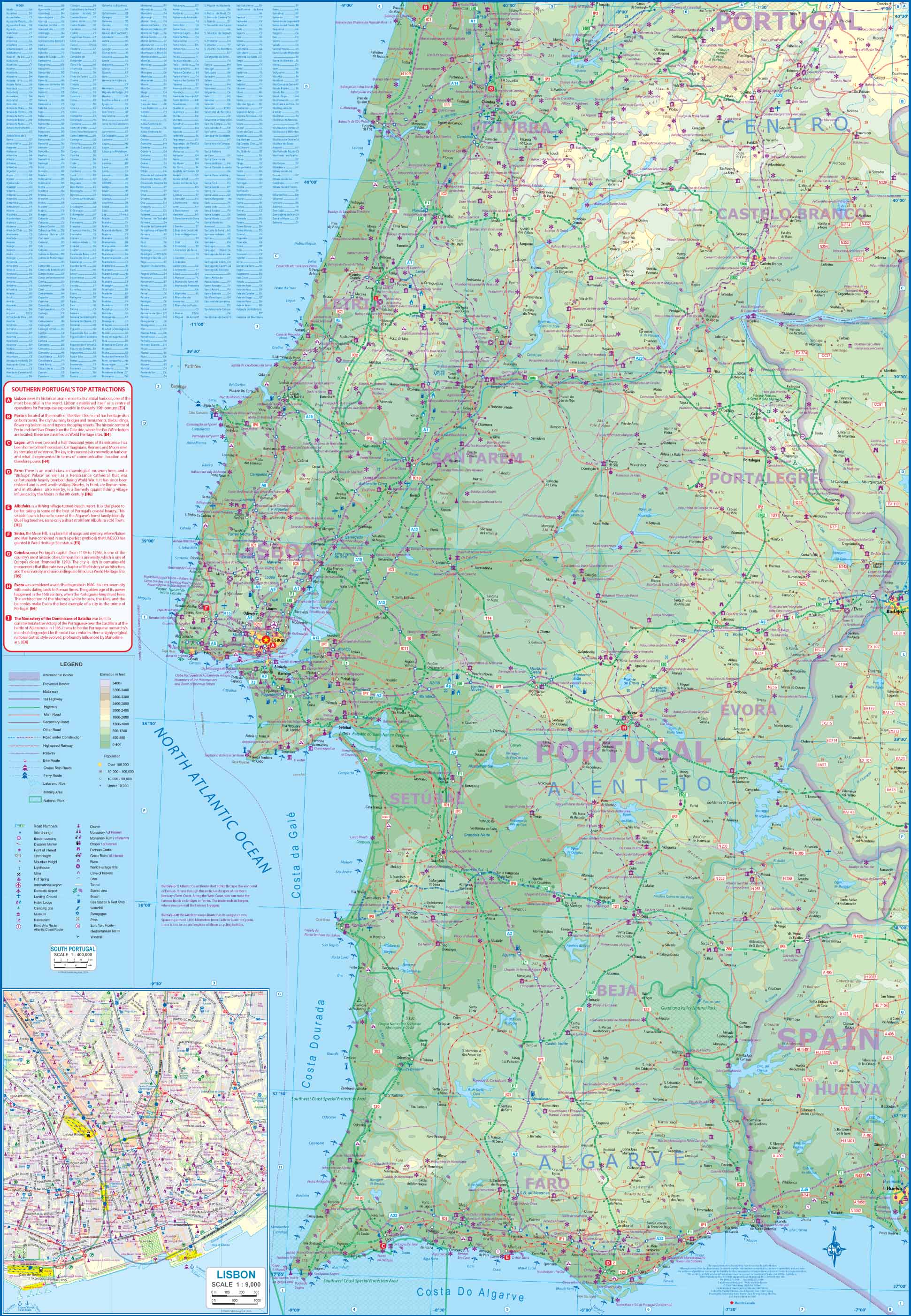 Madeira is a Portuguese-associated island in the Atlantic Ocean, off the coast of Morocco. Volcanic in nature, the island is in the warm Gulf Stream, making it an ideal resort destination throughout the year. The capital is Funchal, and the airport is at Santa Cruz, to the east. The island has ferry connections with the Canary Islands and Morocco, but the usual way of reaching the island, and neighbouring Porto Santo, is by air. The road network is excellent and well-maintained. The reverse side of the waterproof sheet is an up-to-date map of southern Portugal, along with a detailed map of central Lisbon.