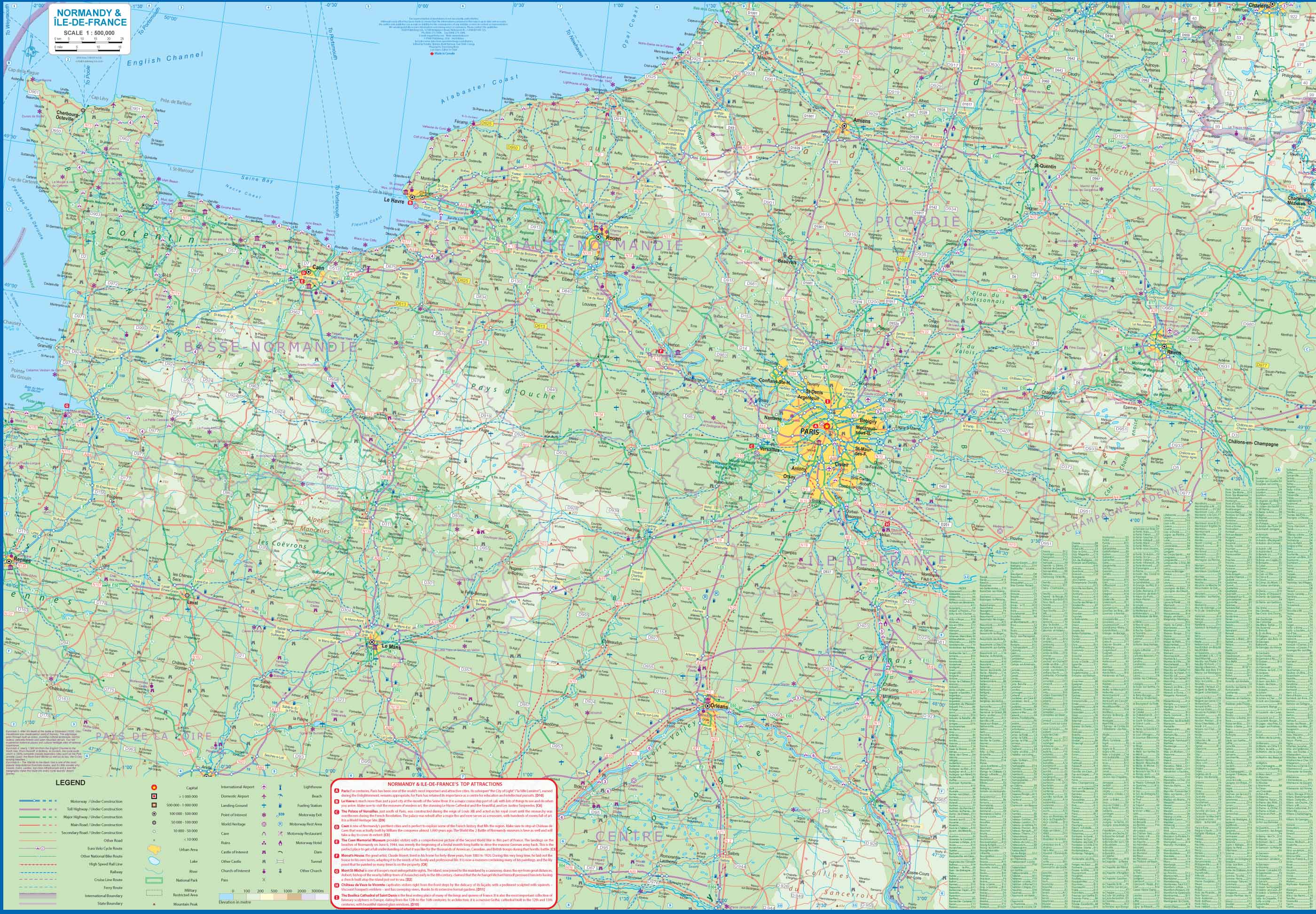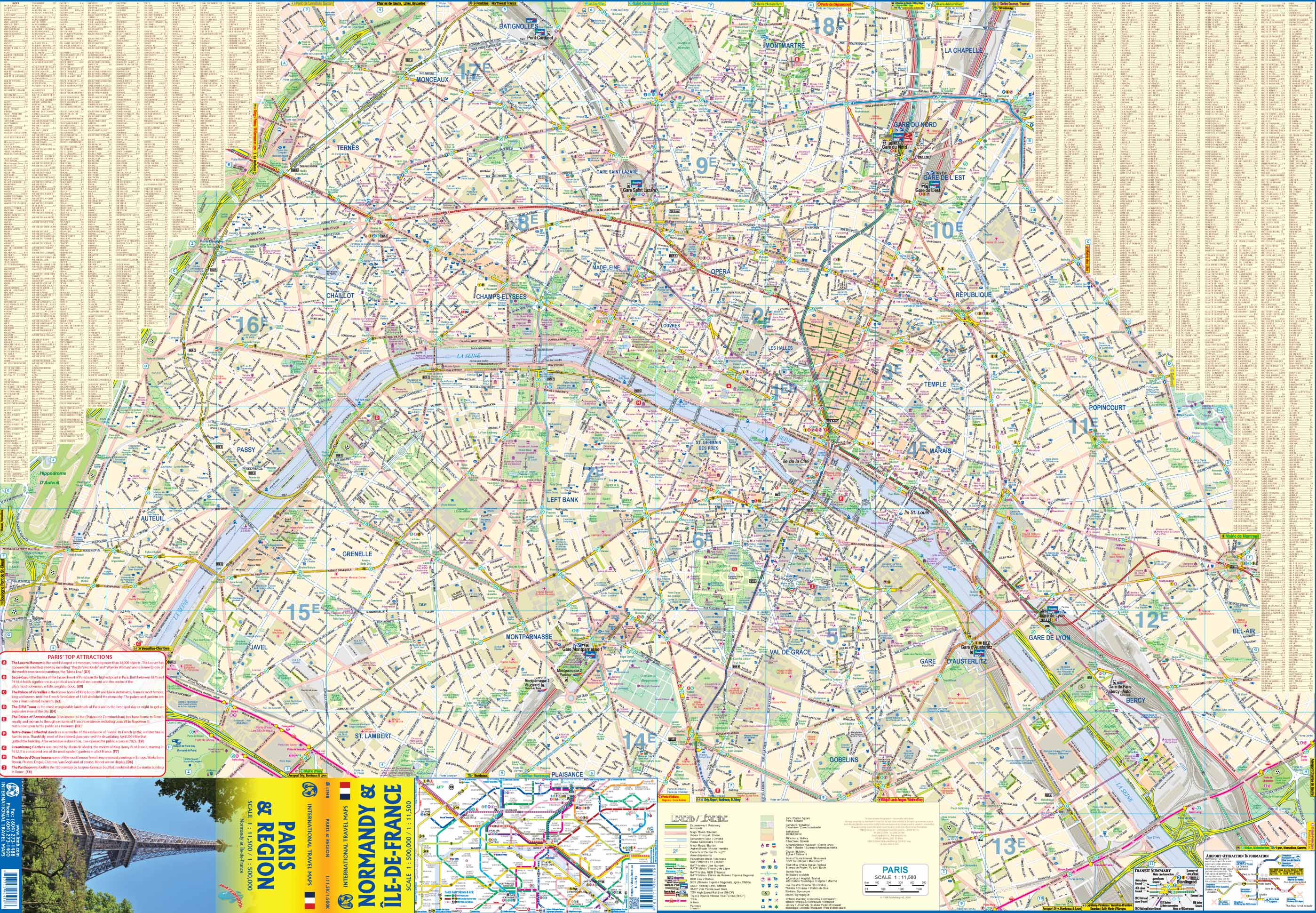 What can one say about Paris that has not been said many times? Side 1 is a detailed street map of the area within the former city walls and shows all the subway (Metro) lines and rail lines with stations. Naturally, touristic sites abound, and are noted accurately on the map. We show a selection of hotels, most museums and major public buildings. The new pedestrian enclave in the 3rd Arrondisement is shown. Side 2 is a new map of the region around Paris,, mostly Normandy and Picardy, so would be useful for those taking day trips to Rouen, Orleans, or Reims. This portion of France is loaded with castles, palaces, and grand chateaux, such as Blois, Chambord, and Fontainebleau, ancient cathedral cities, such as Chartres and Senlis, and historic cities to tempt the traveler to explore. The back cover shows the central Paris Metro network in excellent detail.