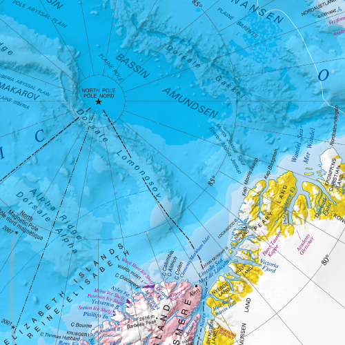 This map has just run out of copies. I know; how can anyone update Greenland? Well, we still have to update the program language to modern usage, and who knows, maybe we have to correct some errors. I don't know. Anyway, it's being updated, whoopie deal. It should be available again in January or February. The North Pole side was updated by Canada Map Office just before we first published this title, so needs no alteration. This title, by the way, has proven to be quite popular.