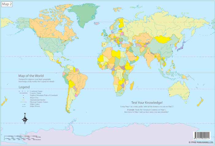 This is a new format for us. We have published compact 13"x8" world map (33cm x 23cm) in two sheets - one with country names and some major cities on it with an identical companion sheet having the same artwork but no names on it. The purpose is to train young people (or anyone, for that matter) in where things are in the world. Map 1 is the study guide with place names; for example South Africa or Peru. Map 2 is the test map, which can be marked up by a student. This is a basic map, designed to improve geographical awareness. It is accurate and uses the same Miller projection as on our World Wall Map. It is available as well in paper (same ISBN) as a set for $2.95. The two mini-sheets are completely separate but sell as a set; however, they could be sold separately, as both fill another existing gap in the map world. They are so small that they would fit inside reports, although somewhat larger than the 8.5x11 page size commonly used in America and somewhat wider than the A$ size used in Europe. They also make useful place mats. Being laminated, they are almost impervious to destruction, but we still have to test it with our two-year-old grandson. If anyone can destroy it, he's the candidate!
